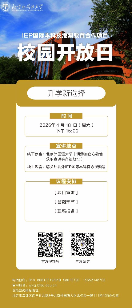 2026-03-30 11:31:32北京外国语大学IEP国际本科及港澳教育合作项目4月18日(周六)校园开放日